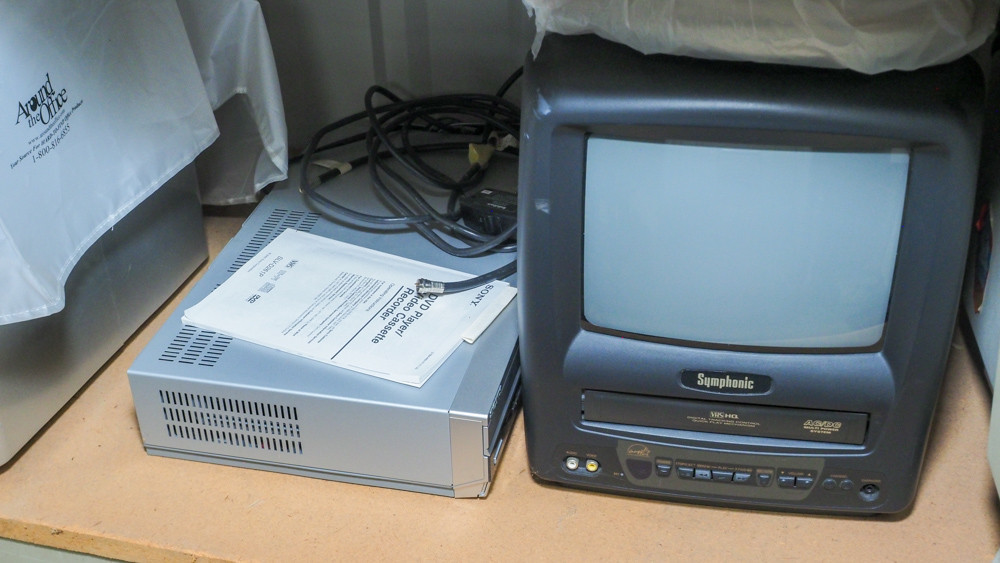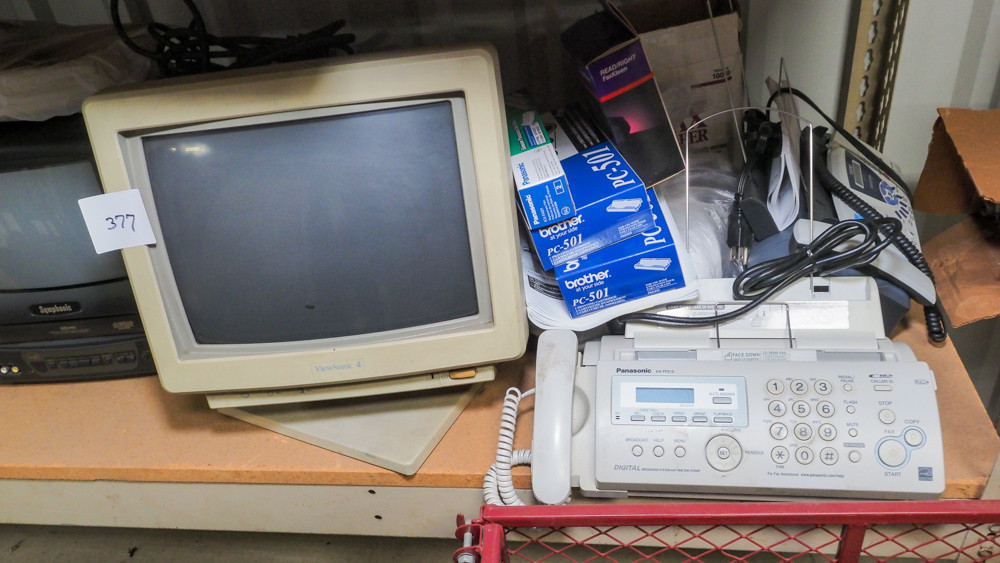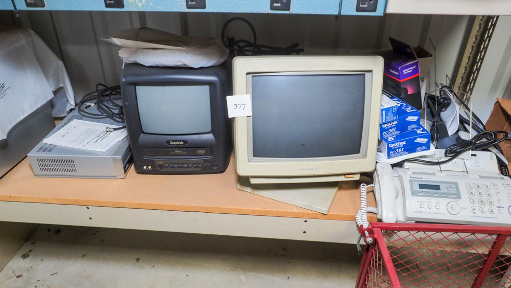 Includes Sony DVD/VHS recorder, Symphonic TV/VHS player, ViewSonic monitor, Panasonic fax machine, Brother fax machine, and more