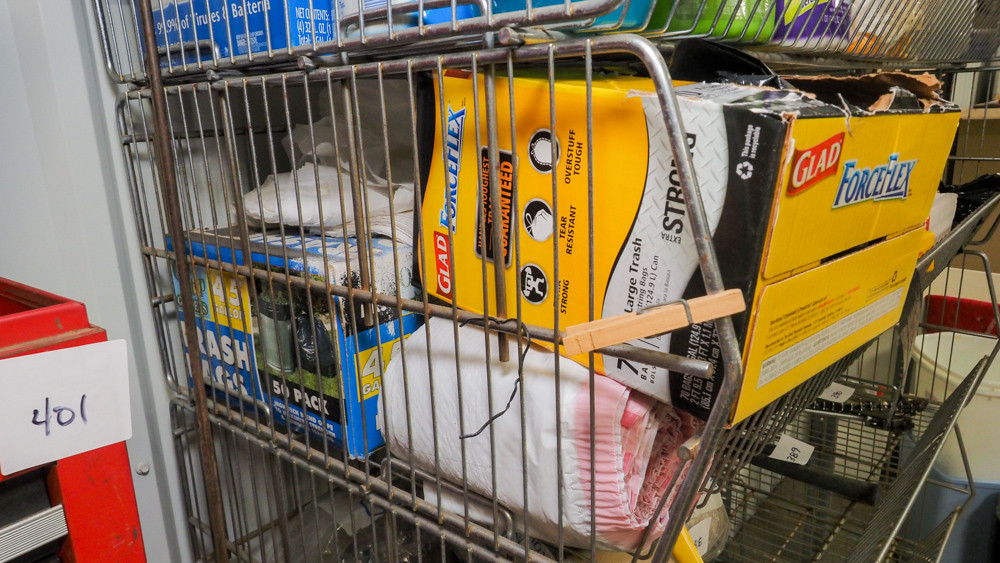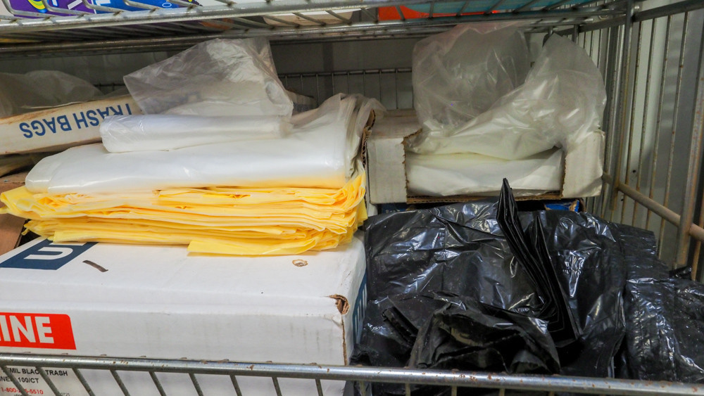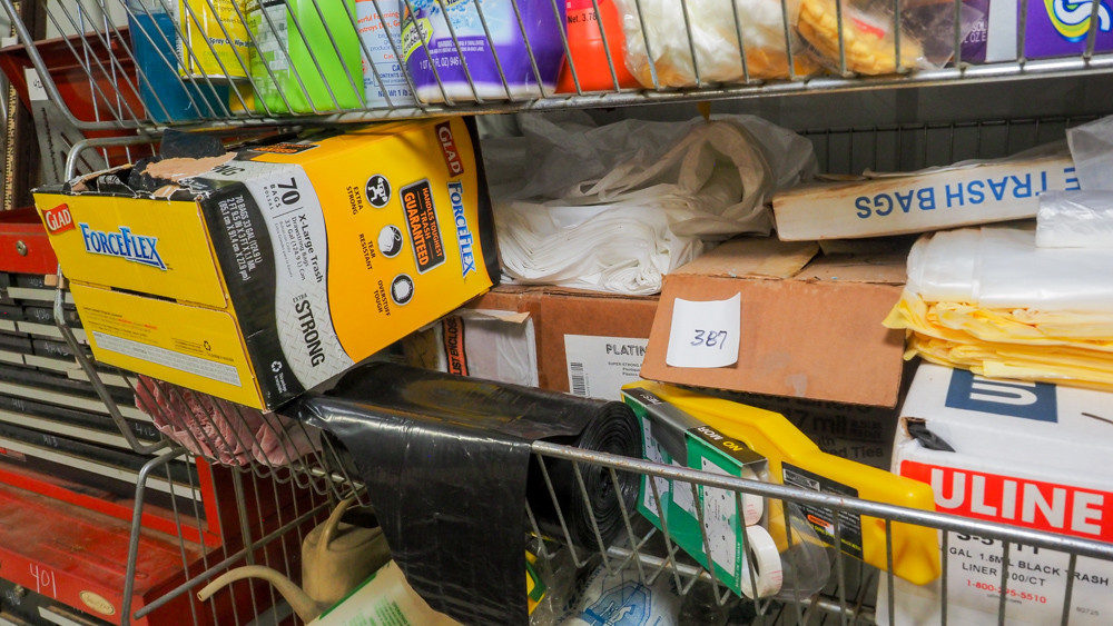 Trash bags, insect fogger, 2 gallon spray tank, garden hose sprayer, watering can, and water hose nozzles