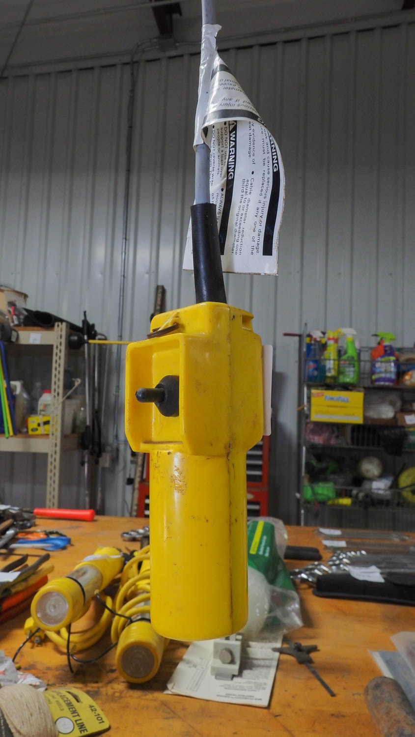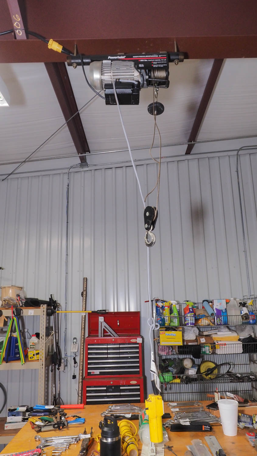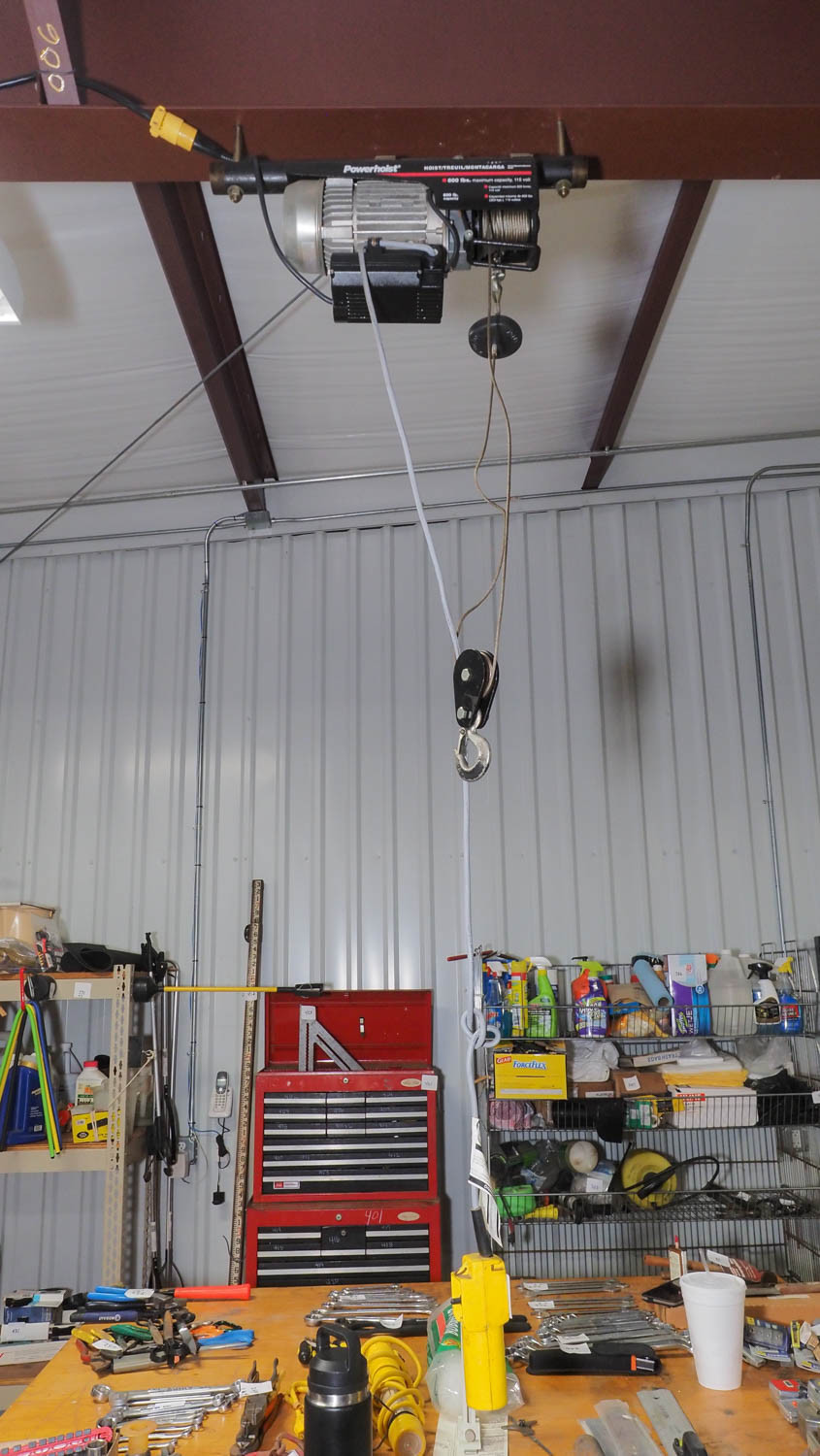 Power hoist with 800 lb capacity, 110V, in working condition.
