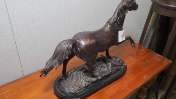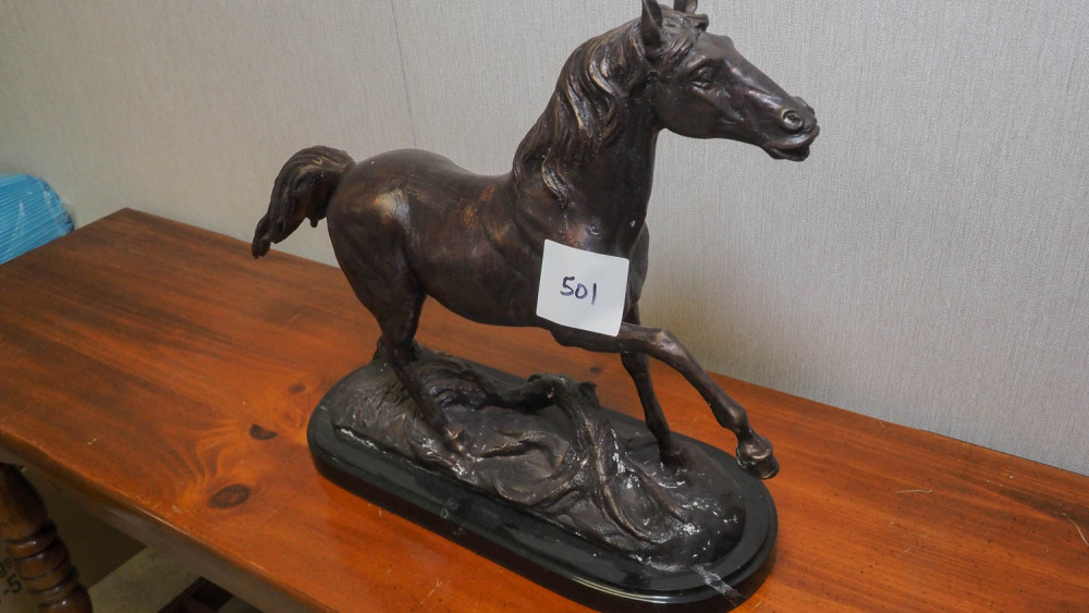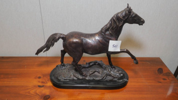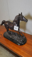 Likely bronze on marble base, detailed work, 20 inches long by 16.5 inches tall
