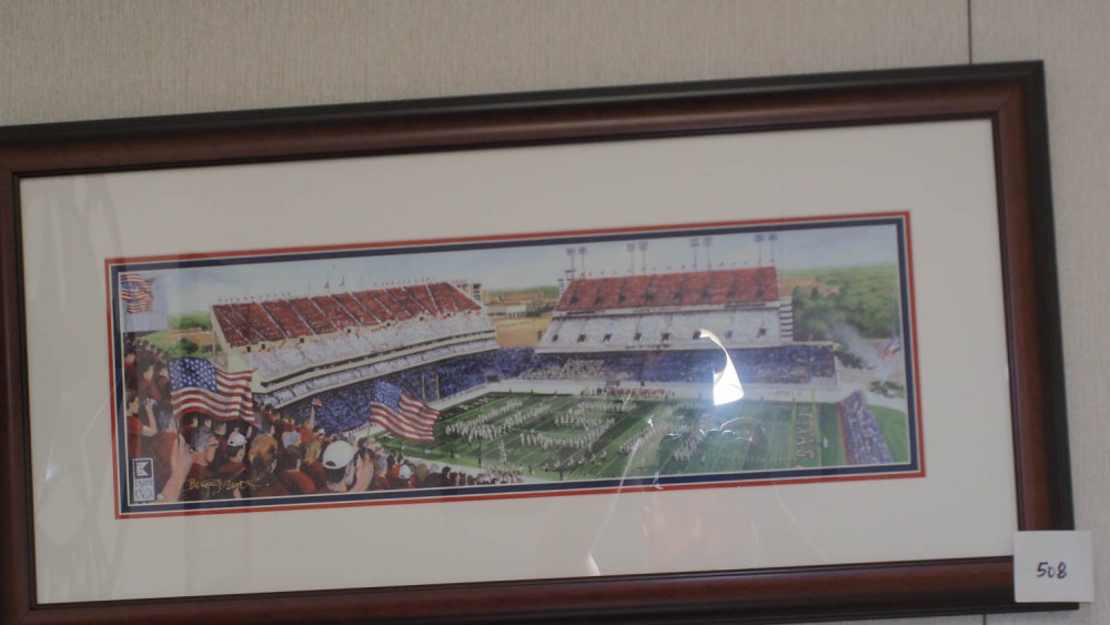 Red white and blue Aggie game, double signed, 16 by 32 inches