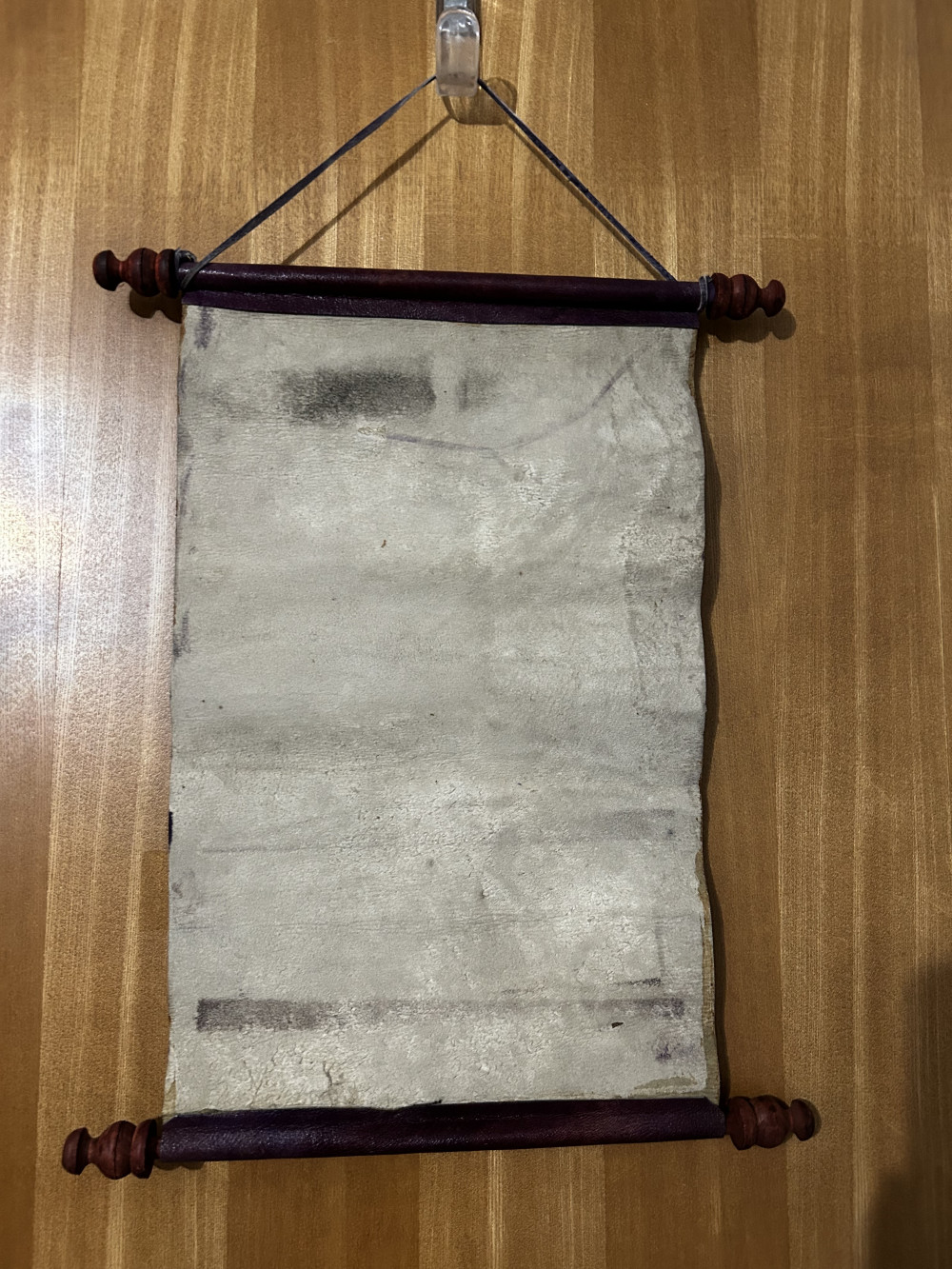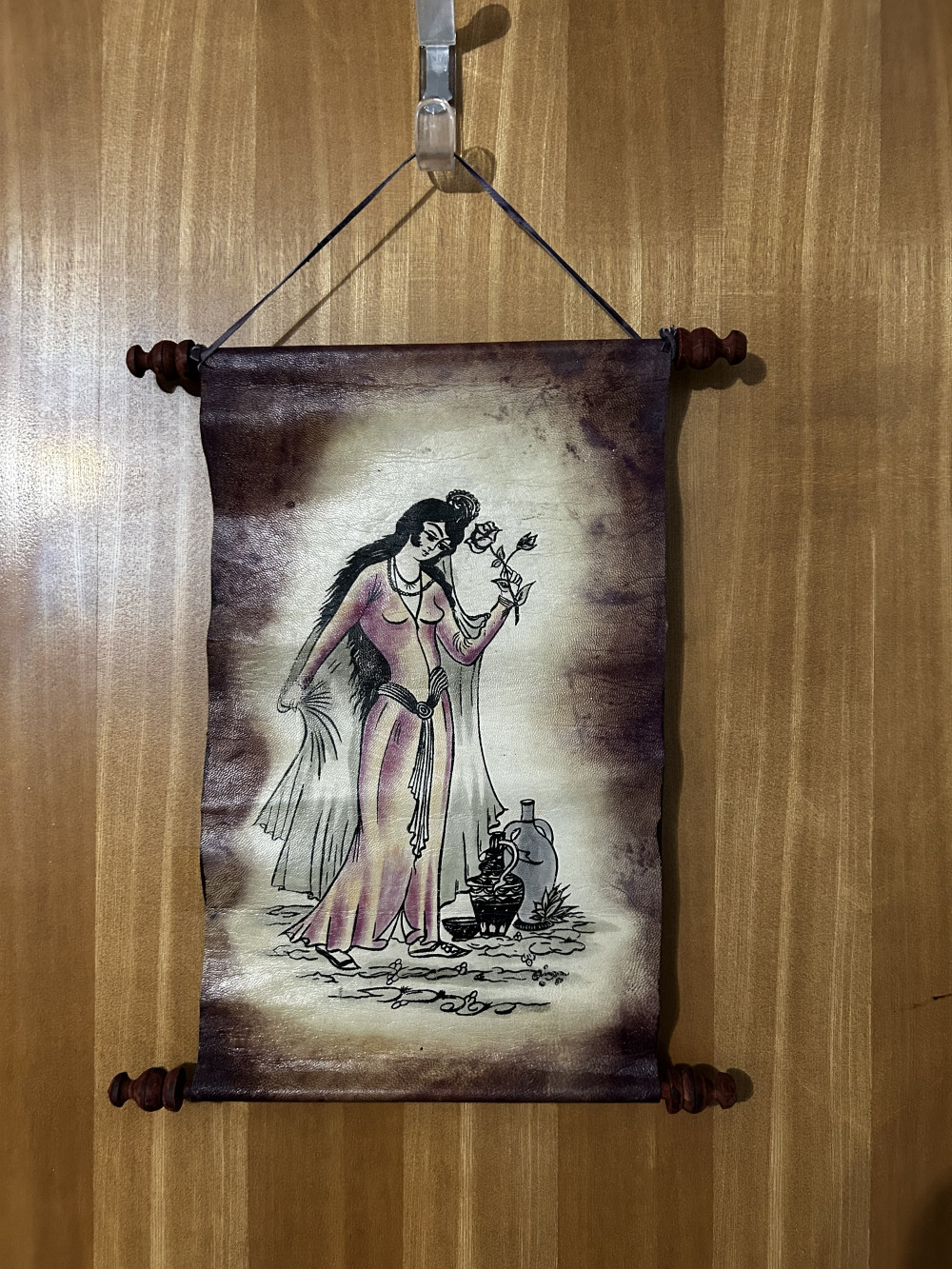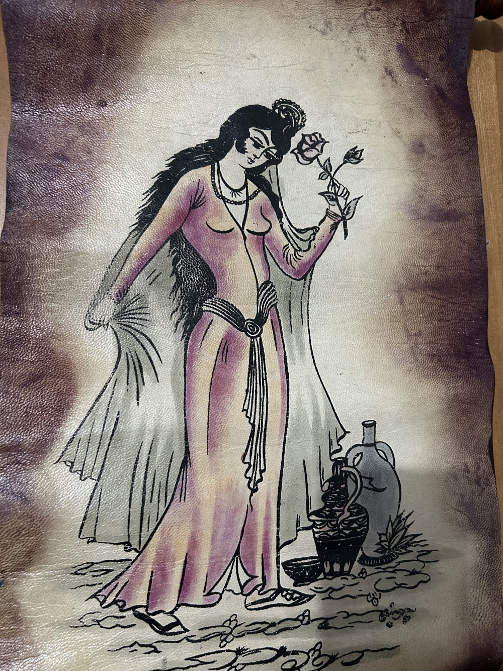 Vintage Persian-style painting on a leather scroll Overall dimensions 18 x 14