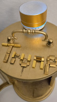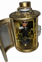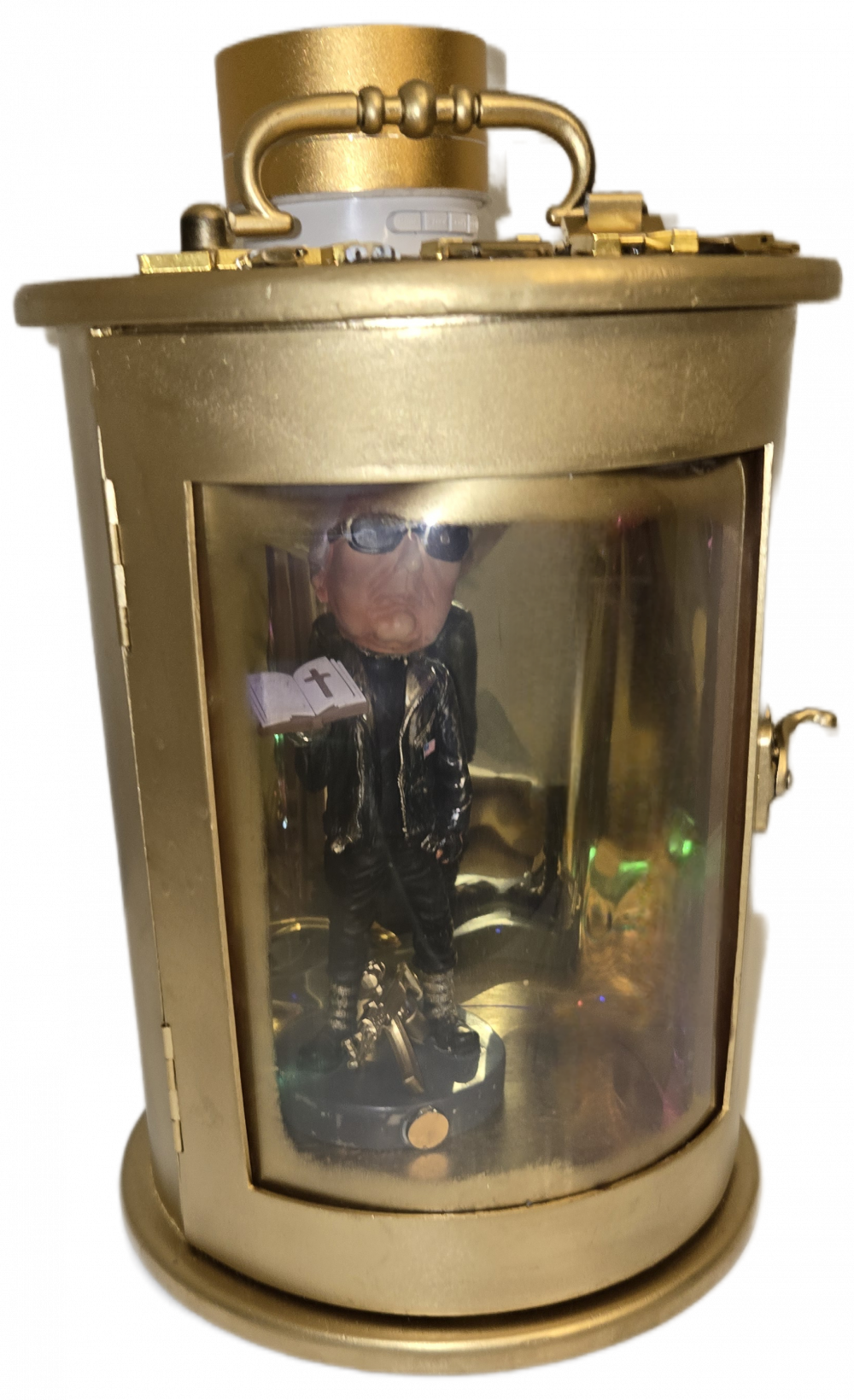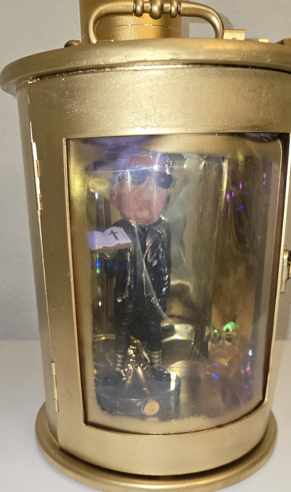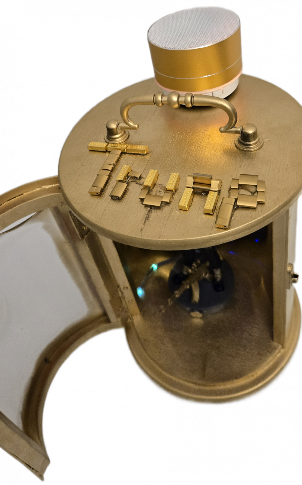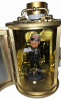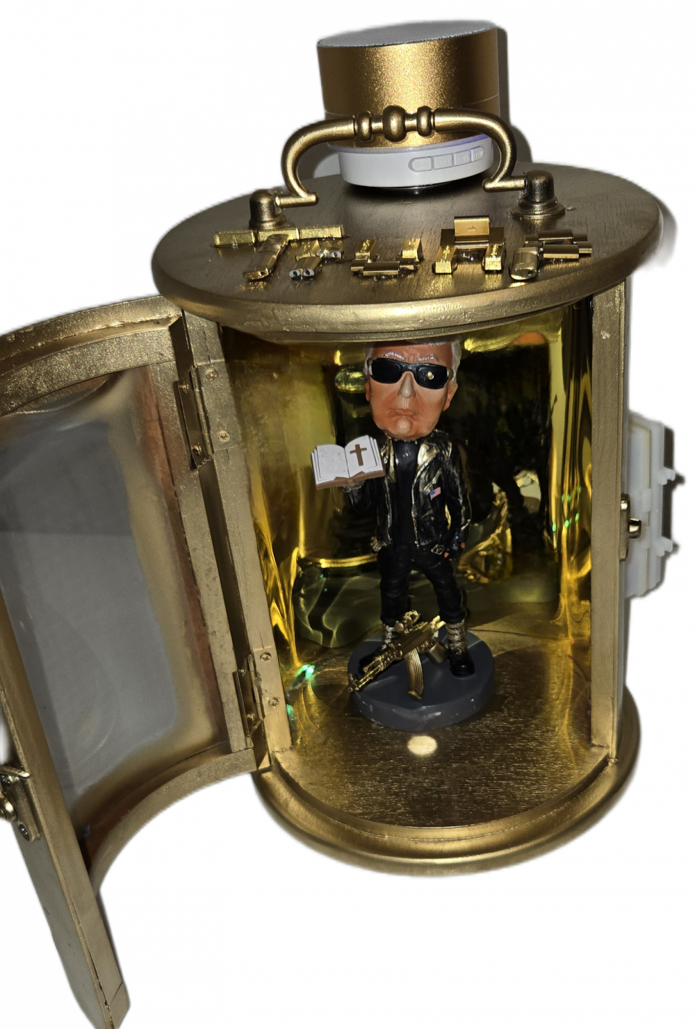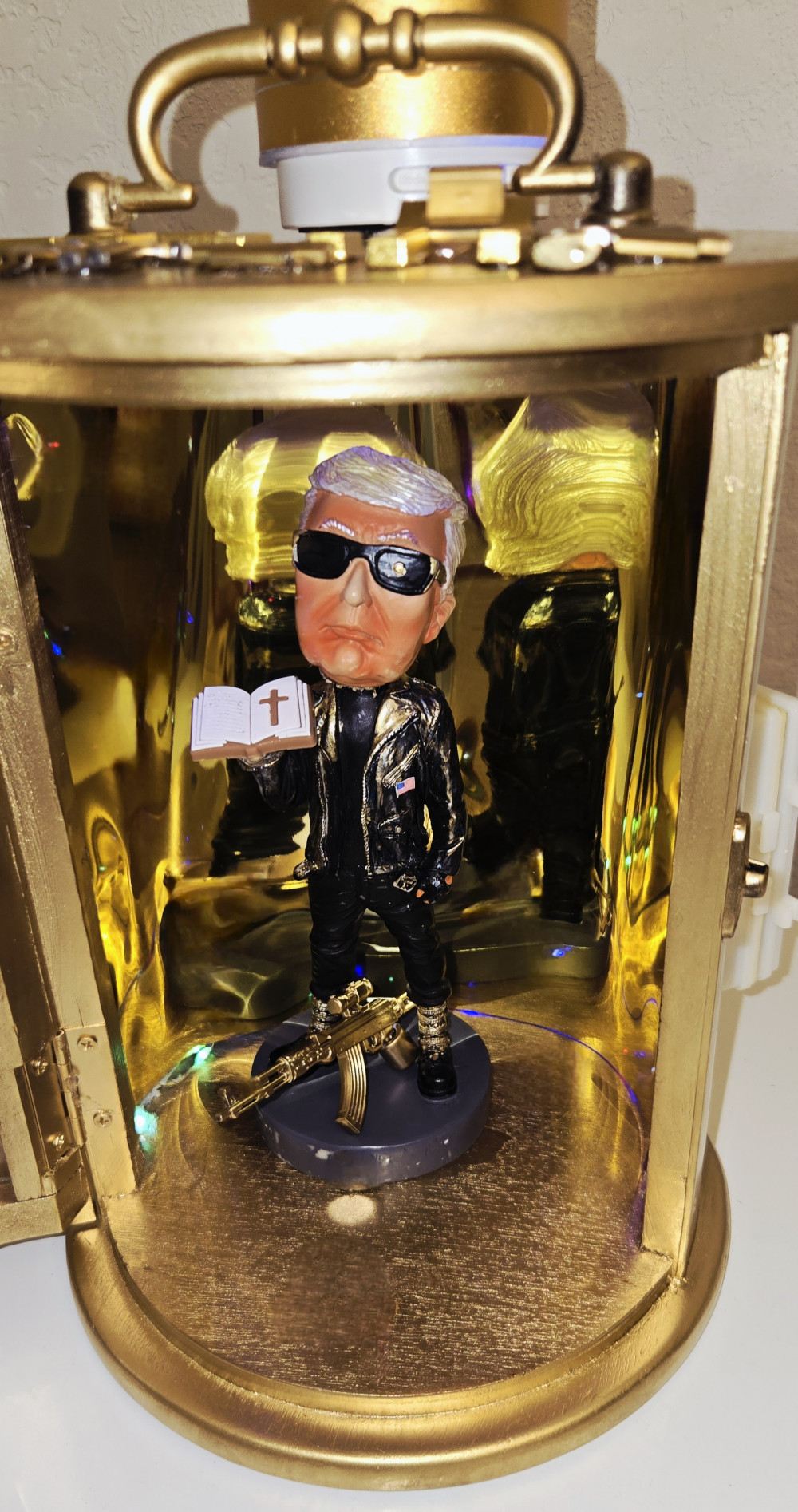 Offered here is a truly unique, one-of-a-kind Donald Trump collectors piece presented in a custom display case with gold bt audio speaker (Plays National Anthem, USA Chant, etc.), features BEATSYNC interior lighting with 4 different illumination modes. This striking conversation piece has been designed for display and collectors appeal, featuring a gold-toned presentation style, hinged glass-front cabinet with latch, and a detailed interior arrangement that gives the item a premium, museum-style presentation.