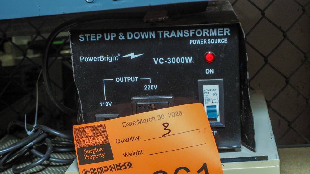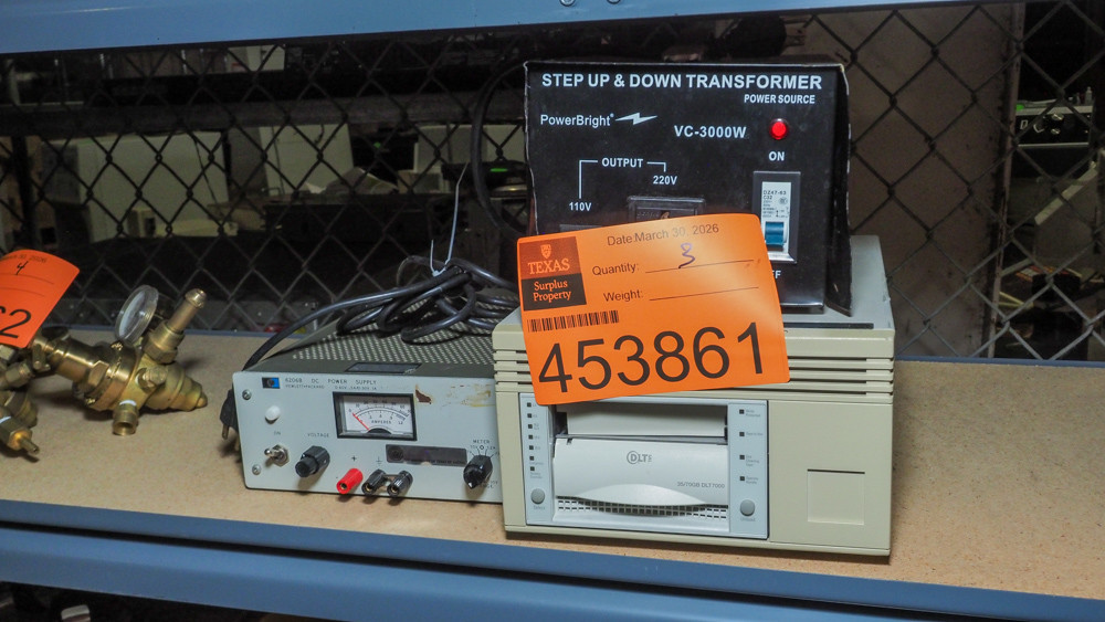 Includes HP6206B DC power supply, Power Bright VC-3000W step up/down transformer, and DLT 35/70 gigabyte DLT7000 *The University of Texas at Austin makes no claim of physical or mechanical , and functionality of items available through SWICO Auctions. All items are sold “As is, where is”. It is the sole responsibility of the bidder to physically inspect items before bidding and assume all risk. Photos and descriptions are for preview only. All sales are final and no refunds will be issued. Please refer to the SWICO “Terms of Service” in which you have agreed to.