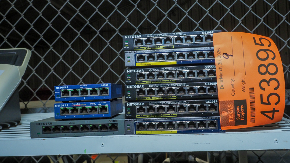 Models include GS105, GS308, GS308P, and GS108PE Condition:Unknown; no power cords available *The University of Texas at Austin makes no claim of physical or mechanical , and functionality of items available through SWICO Auctions. All items are sold “As is, where is”. It is the sole responsibility of the bidder to physically inspect items before bidding and assume all risk. Photos and descriptions are for preview only. All sales are final and no refunds will be issued. Please refer to the SWICO “Terms of Service” in which you have agreed to.