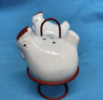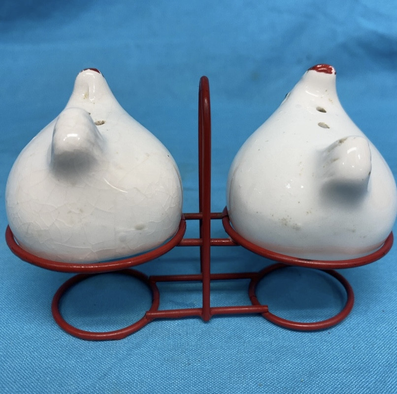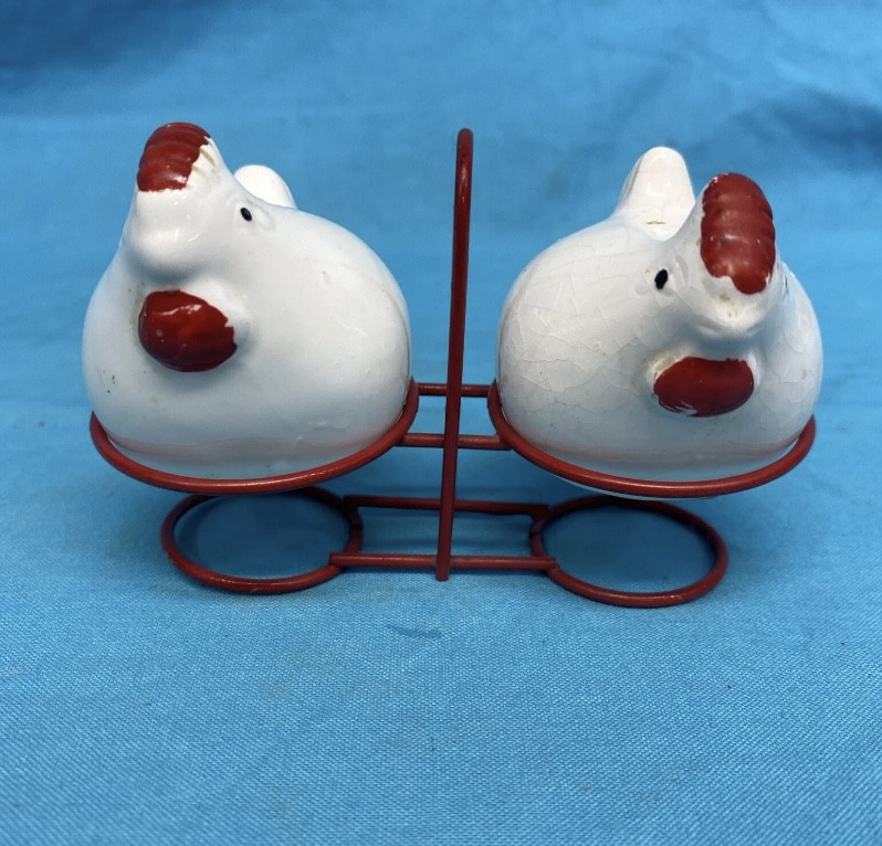 And primitive Vintage chicken Salt & pepper Shakers in Red tin holder wire holder