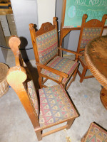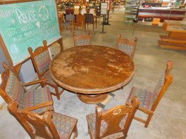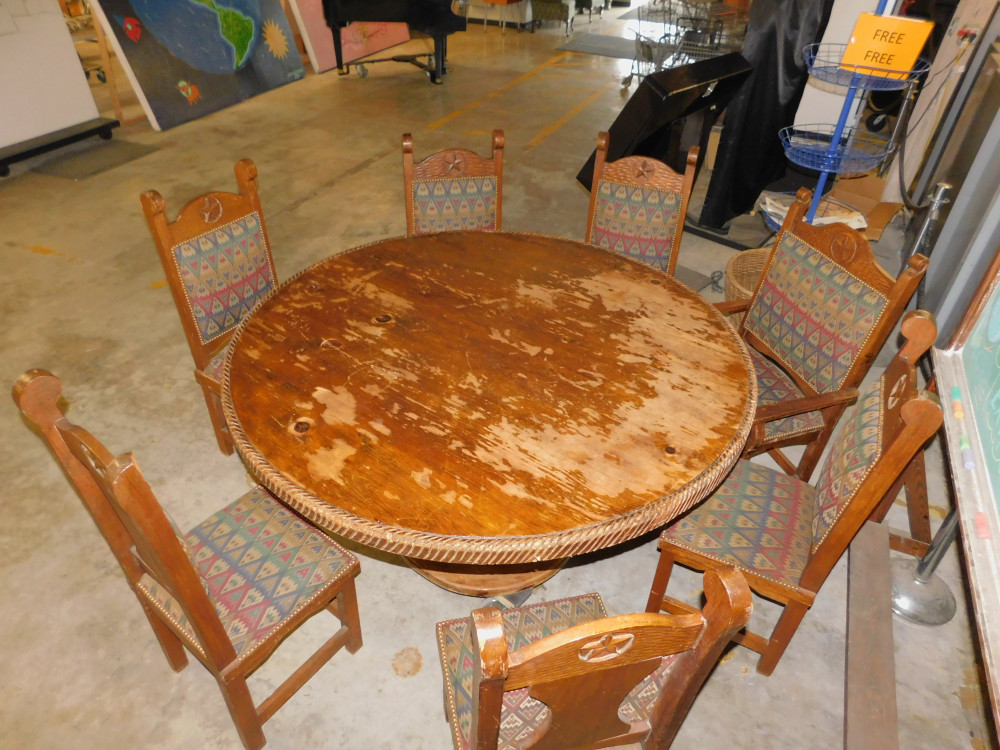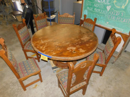 Ornate Large Wooden Table set with 7 chairs. Largest chair has arm rests. Table and chairs all have general wear and tear all around to their finishes. 5 feet diameter.