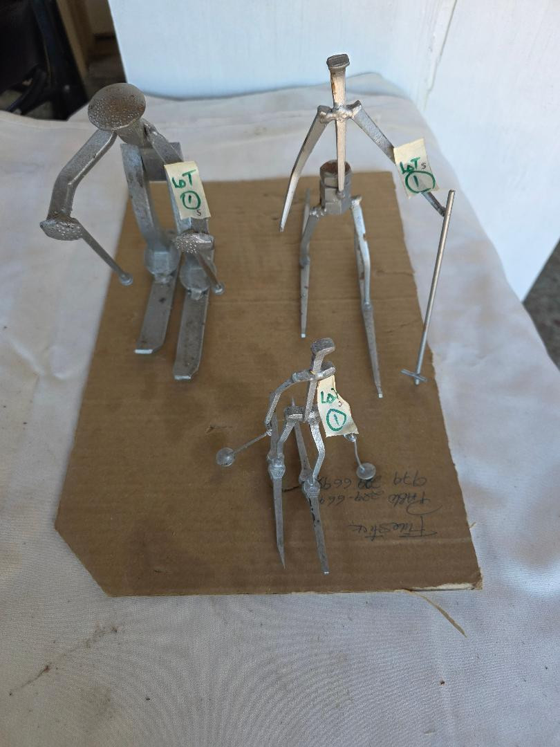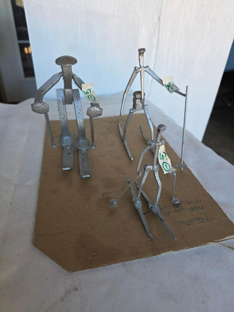 A family out for a day on the slopes. We have dad, mom and child made out of various screws, nuts, bolts and railroad ties.