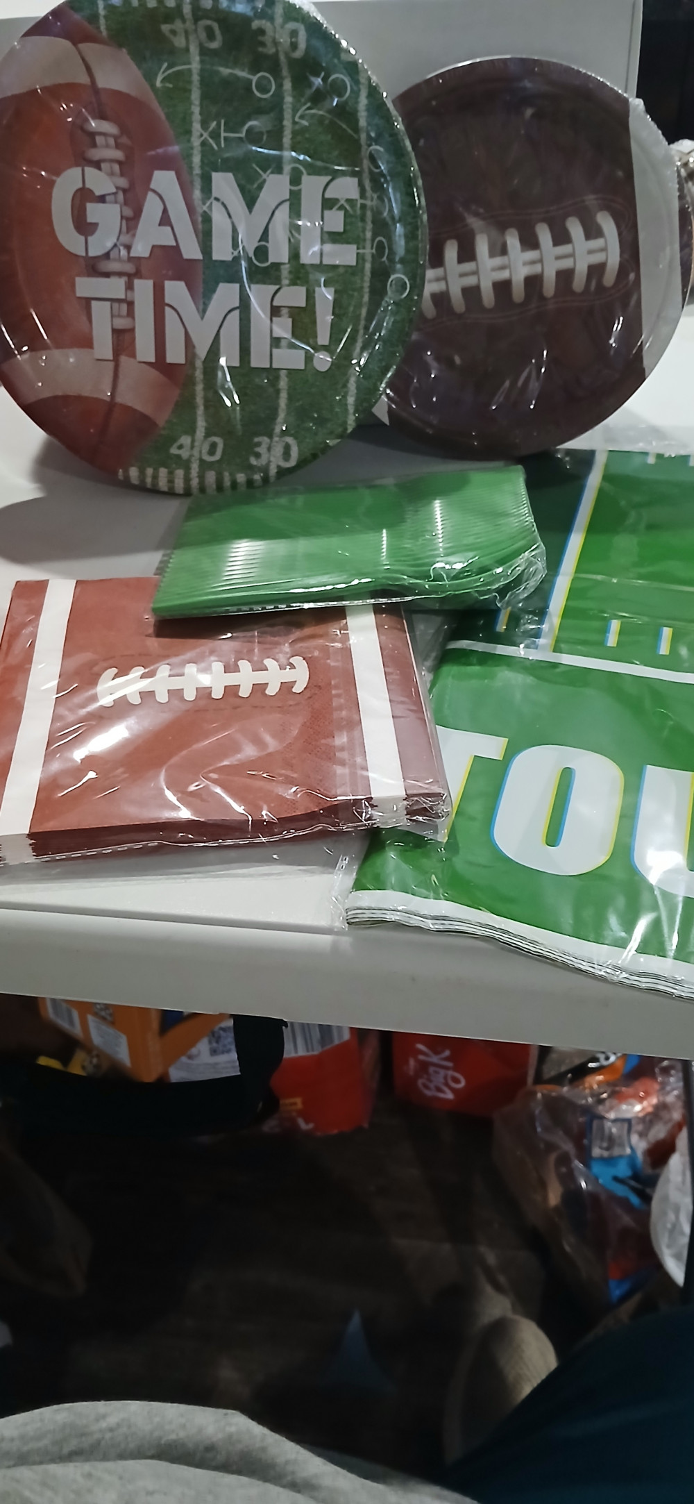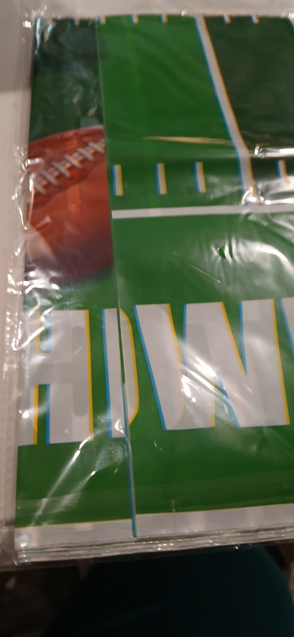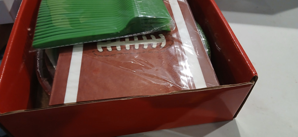 This is for a new Football party kit. Includes plastic tablecloth, , forks, 2 different size plates and napkins all in a footballtheme. All brand new in box.