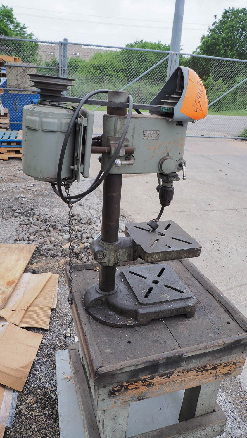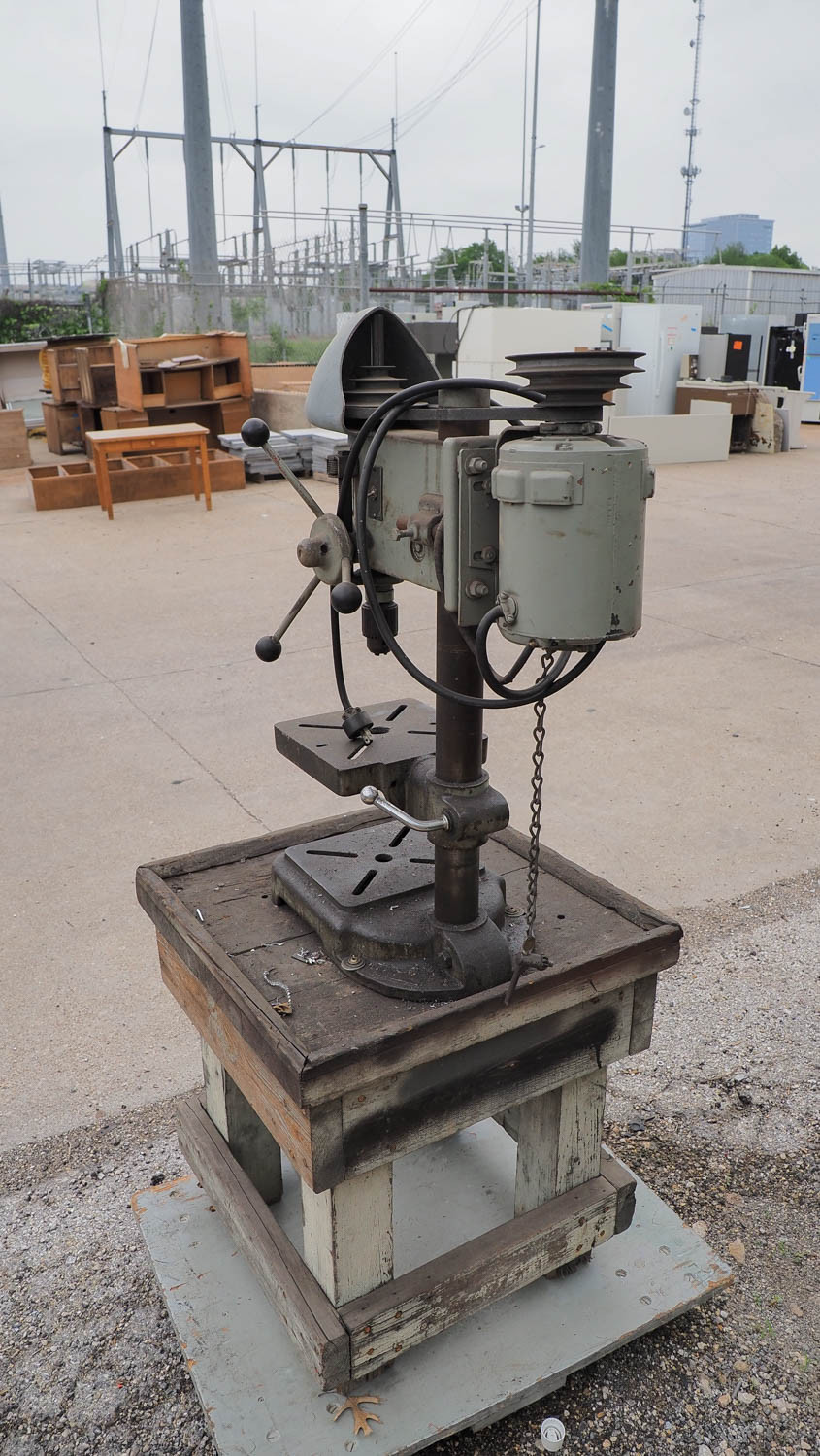 Atlas drill press; height of the drill press is 33 inches. Comes with a wood base that measures 23 x 22.5 x 24 inches tall. 110 volt. Condition:Condition unknown *The University of Texas at Austin makes no claim of physical or mechanical , and functionality of items available through SWICO Auctions. All items are sold “As is, where is”. It is the sole responsibility of the bidder to physically inspect items before bidding and assume all risk. Photos and descriptions are for preview only. All sales are final and no refunds will be issued. Please refer to the SWICO “Terms of Service” in which you have agreed to.