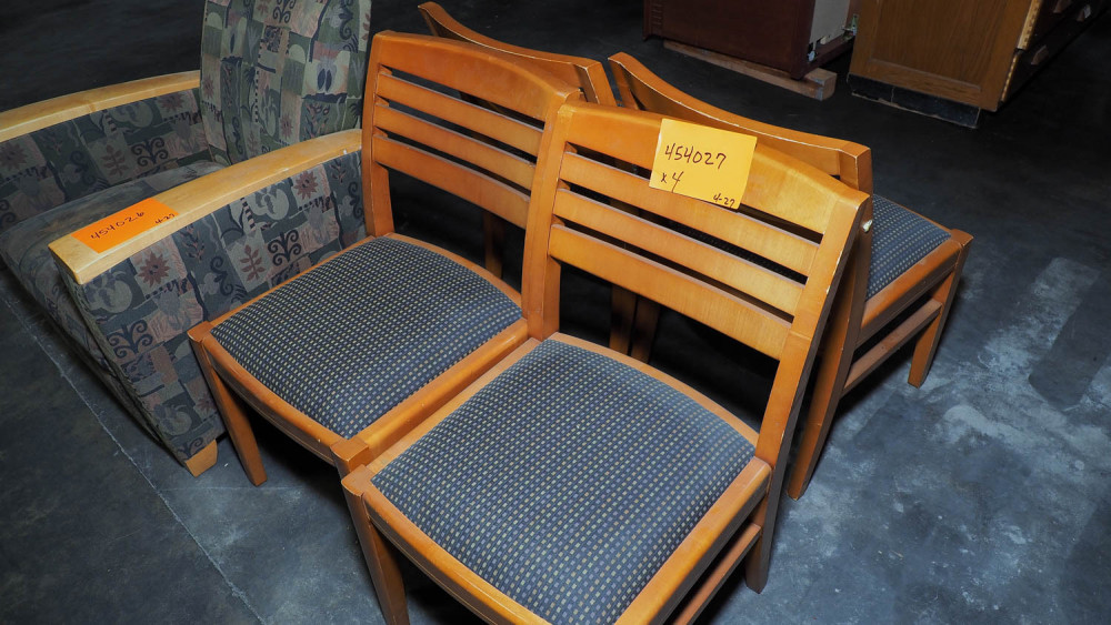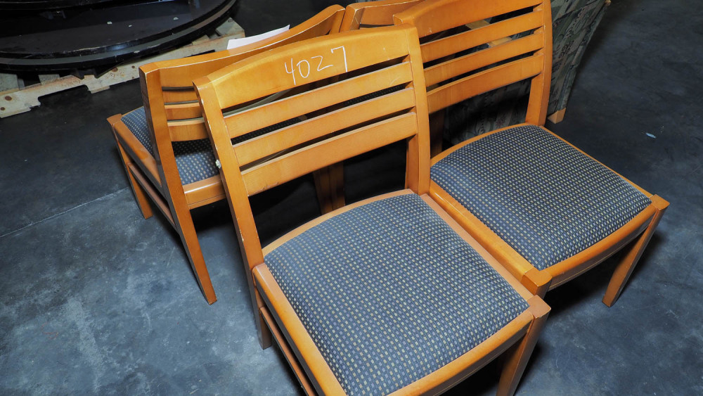 Seven wood chairs with fabric cushioned seats. *The University of Texas at Austin makes no claim of physical or mechanical , and functionality of items available through SWICO Auctions. All items are sold “As is, where is”. It is the sole responsibility of the bidder to physically inspect items before bidding and assume all risk. Photos and descriptions are for preview only. All sales are final and no refunds will be issued. Please refer to the SWICO “Terms of Service” in which you have agreed to.