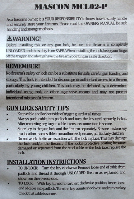 Description: Two (2) each new Mascon gun locks. Your choice of red, blue, black, (black is the one pictured). These work with most any rifle, bolt or automatic, pistols automatic or revolver. Comes with 2 keys and owners instruction.