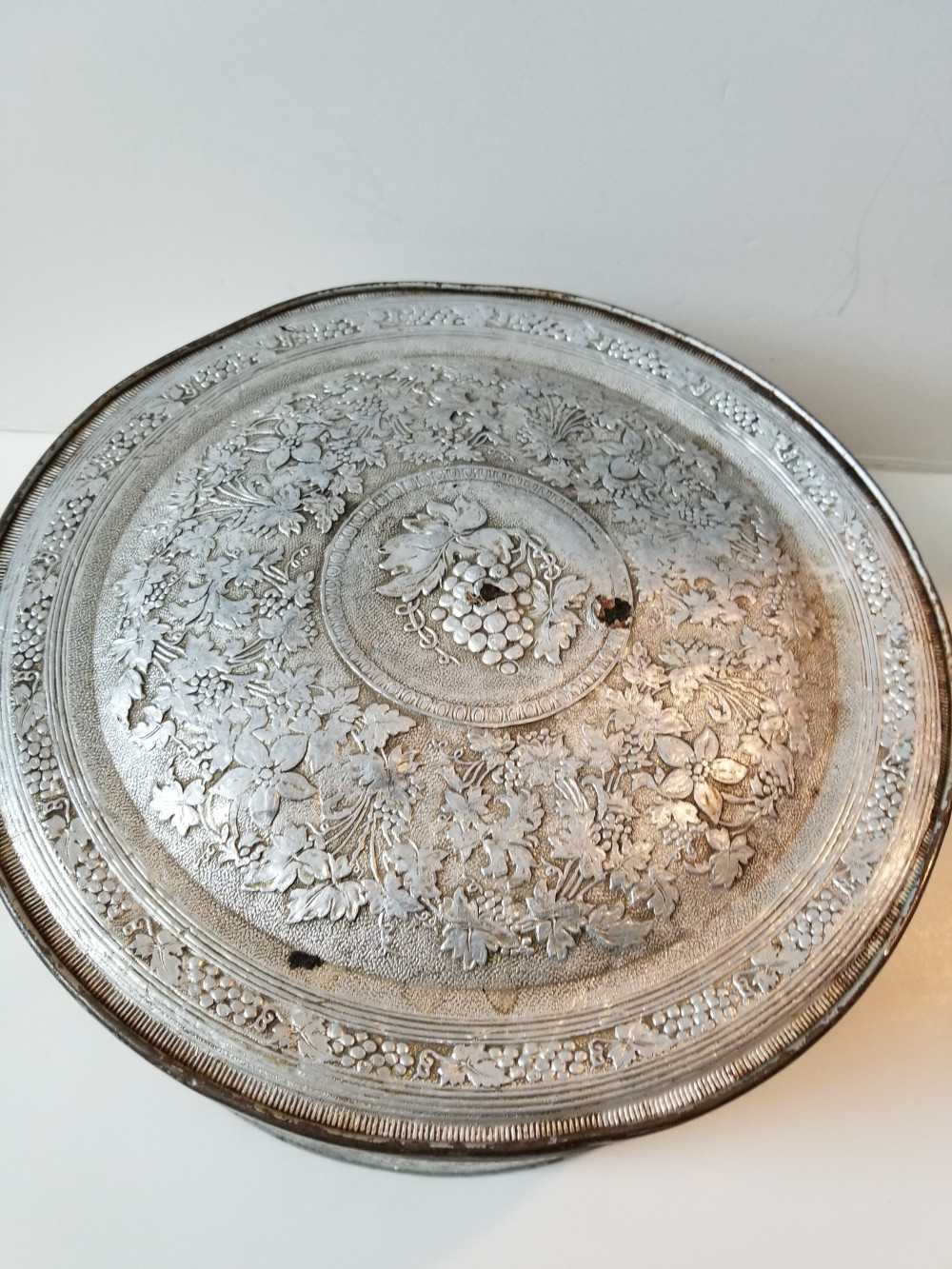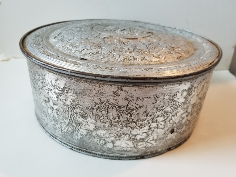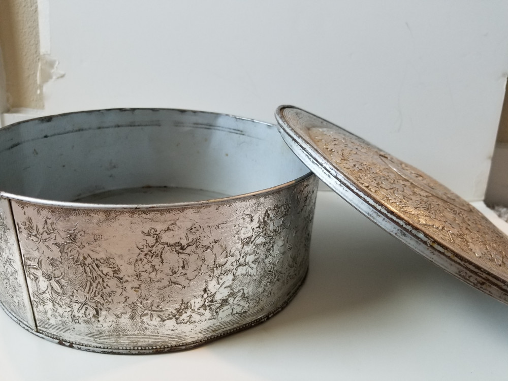 Vintage Guildcraft New York collectible ornate grapevine fruitcake tin.