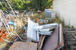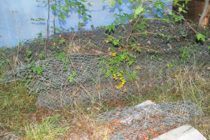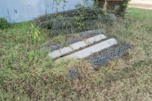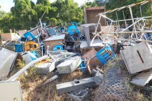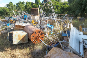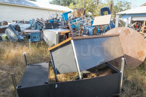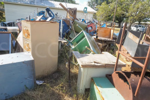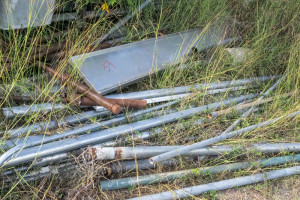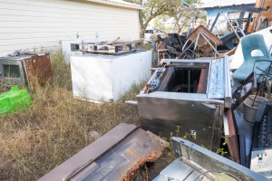 Main pile is 14 x 24‘ includes sheet metal, stainless steel, metal desks, appliances, student desks, file cabinets, TV mounts. Second pile includes fencing material, galvanized chain-link fence posts, weightlifting bars, stainless steel shelf, weightlifting bench press racks, chain link fencing