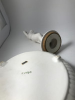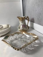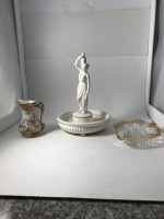 Greek figurine , bowl trimmed in gold and small pitcher.