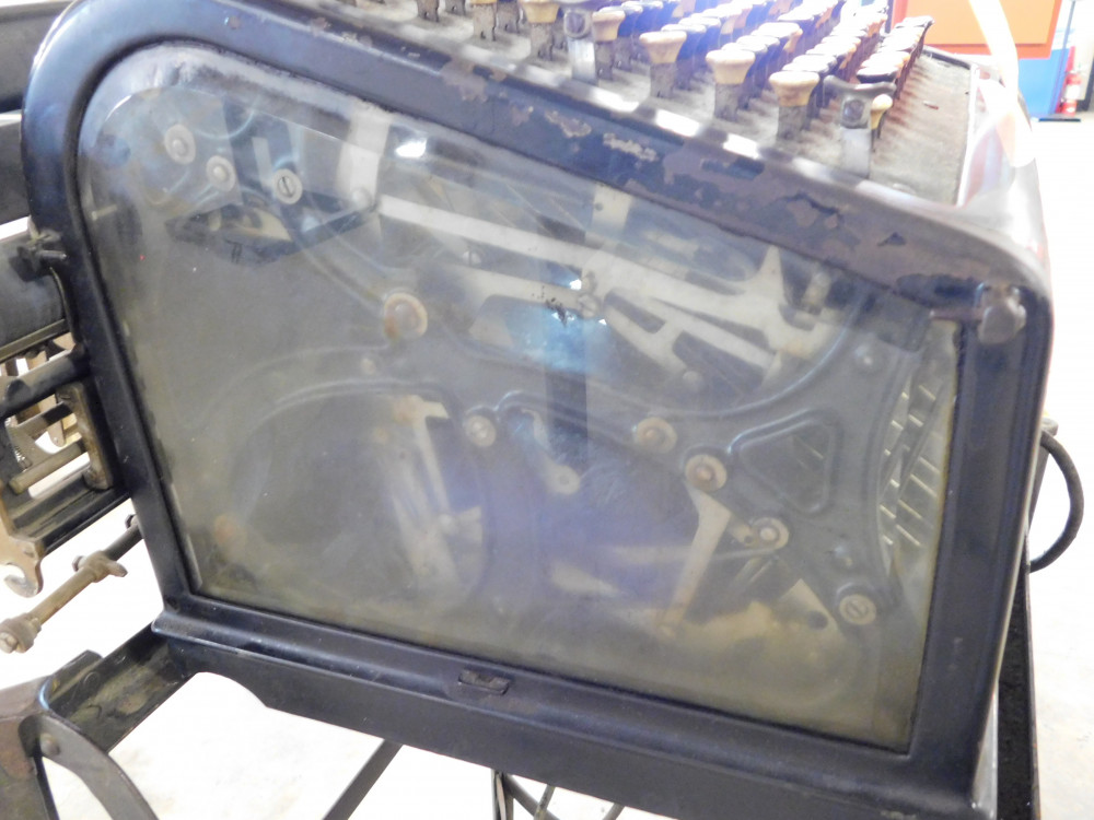 1906 Burroughs adding machine with stand, beveled glass case, condition unknown.